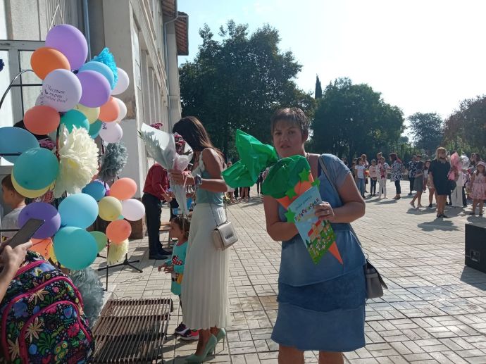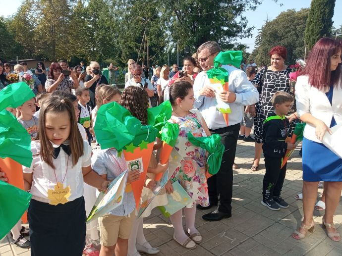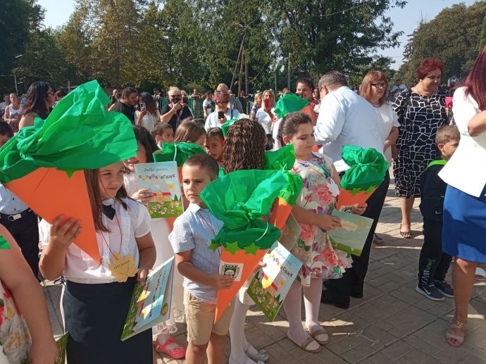 По традиция за най-малките ученици – „зайците“ от общинската администрация подготвиха подаръци – книжка и учебни помагала, облечени в картонен морков за повече настроение и цвят в днешния слънчев ден.