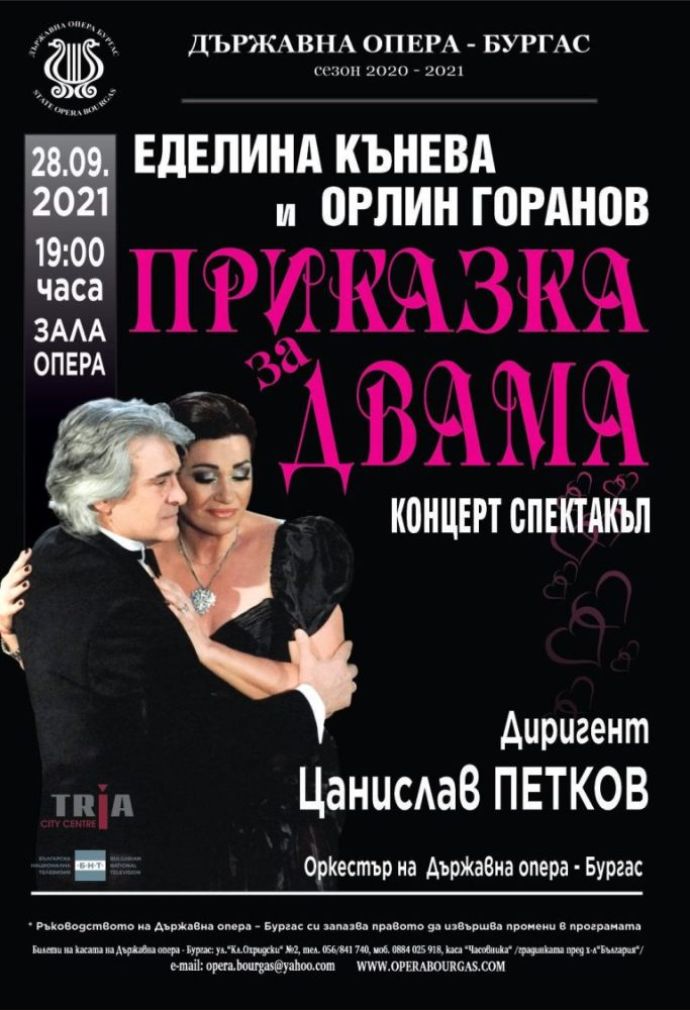 След големия успех на „Приказка за двама“ с участието на звездната сценична двойка Еделина Кънева и Орлин Горанов на Амфитеатъра в Несебър през м. август, т. год., където Държавна опера – Бургас имаше специална поканена за празника на града, един от най-романтичните и издържани – и като подбор на песните, и като мултимедия, и като изпълнение, концертни спектакли на Бургаската опера ще бъде представен отново на бургаска сцена – на 28 септември, вторник, от 19 часа в залата на Операта. Това е първата проява от творческия календар на новия Сезон 2021/ 2022 г. на бургаската културна институция. Програмата, предвидена за следващия месец октомври е доста наситена, като включва дългоочаквана премиера, оперни, оперетни и балетни спектакли, концертни прояви и т.н. Очаквайте и изненади!