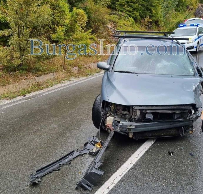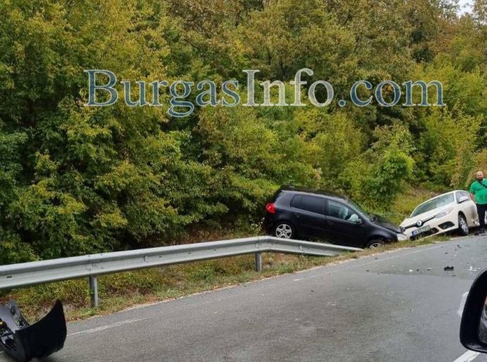 Лек автомобил „Волво“, с бургаска регистрация, е навлязъл в лентата за насрещно движение в условията на десен завой, като блъска последователно движещите се в посока Бургас, „Фолксваген“ с бургаска регистрация и „Рено“ с турска регистрация, поясниха от полицията.