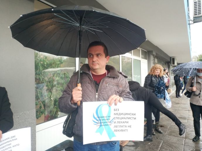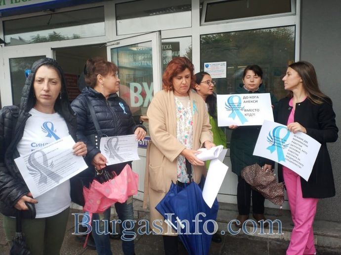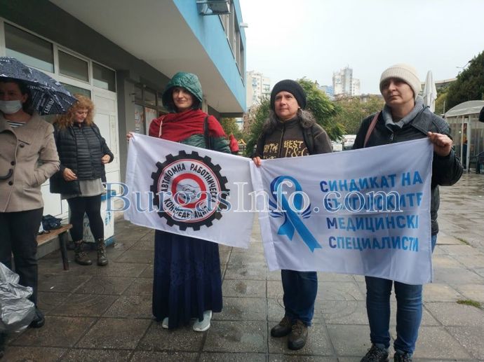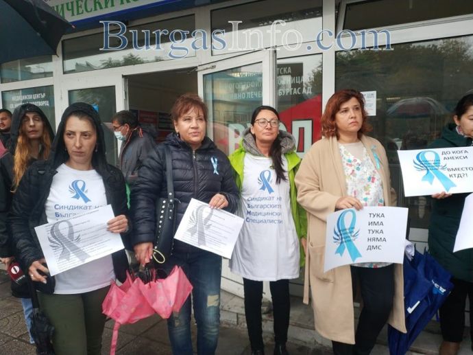 Проливният дъж в Бургас не сломи недоволството на медицинските специалисти, които днес в 12 ч. излязоха на протест пред УМБАЛ Бургас. Облечени с тениски на синдиката те издигнаха плакати: „Без медицински специалисти и лекари, леглата не лекуват”, „До кога анекси, вместо КТД”.