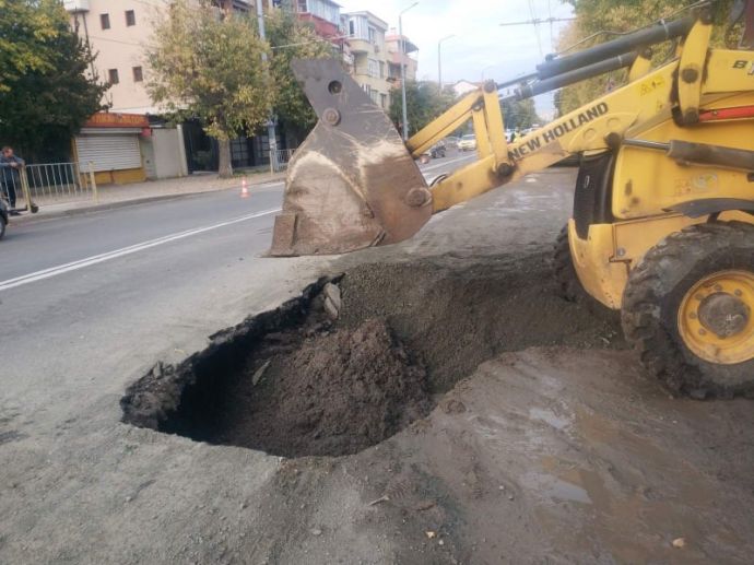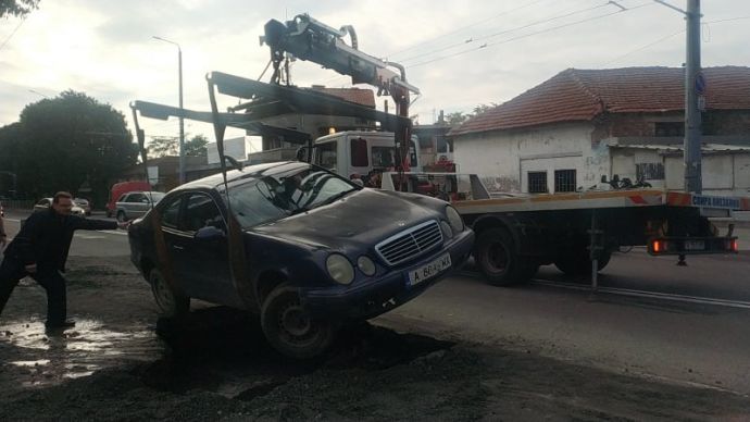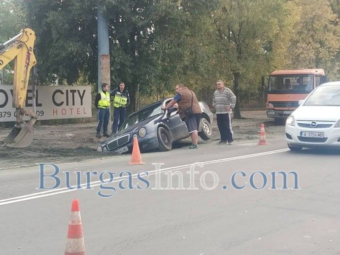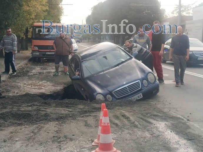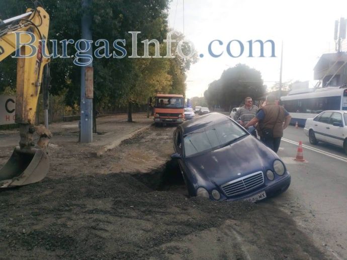 Лека кола "Мередес" се окопа буквално в ремонт на ул. "Индустриална" в Бургас, който в момента се извършва поради ВиК авария. Автомобилът, с бургаска регистрация, е бил управляван от 37-годишен мъж, като с него е била и възрастната му майка. Според очевидци колата не е могла да спре и е пропаднала на мястото в момент, в който работниците посипвали чакъл.