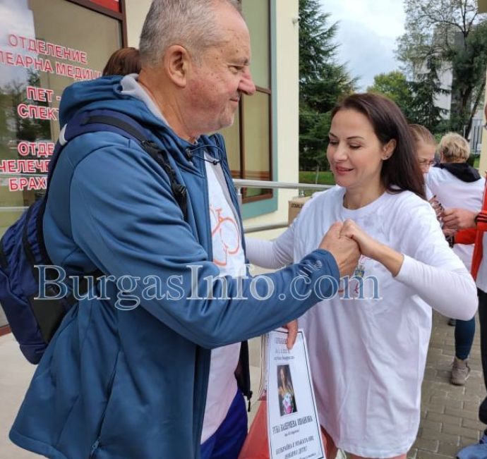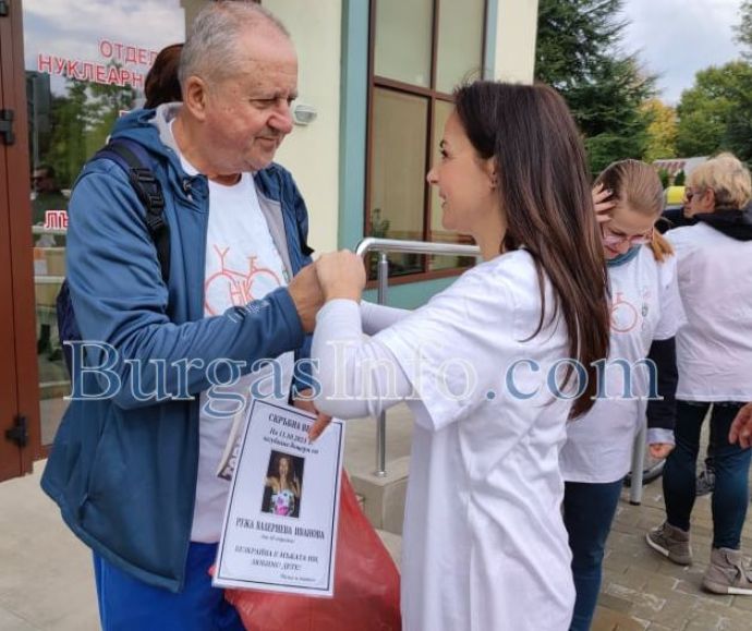 Бащата Валери Вълчев намери сили в болка си след като само преди две седмици загуби дъщеря си Ружа Иванова на 43 години, която 2 години се е борила в карцином на гърдата. Днес той в нейна памет и с признателност към лекарите от Комплексния онкологичен център (КОЦ) – Бургас дари три перуки в помощ на онкоболни жени, както и 20 неизползвани бележки за кръв. Трогателният жест той направи днес, по време на благотворителна инициатива „Велотон” - съвместно каране на велосипеди на лекуващи, пациенти и техните близки, чийто патрон е актрисата Гергана Стоянова и е част от поредицата „Спортувай с мисия КОЦ – Бургас”.