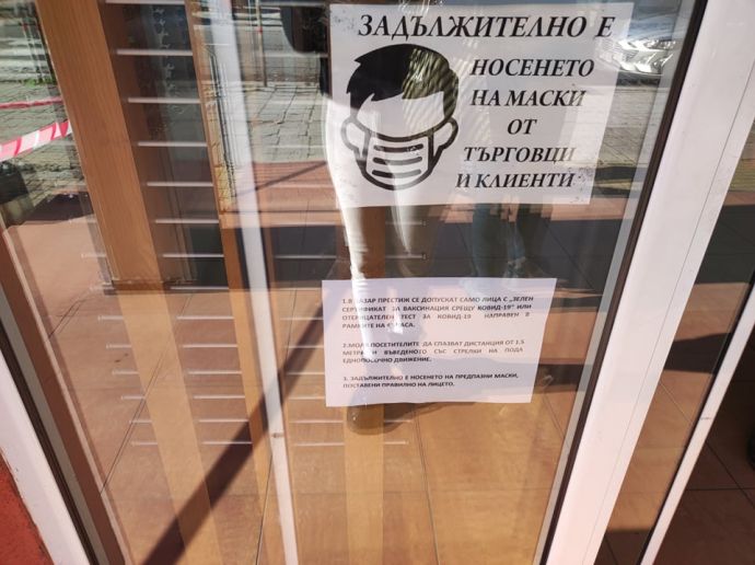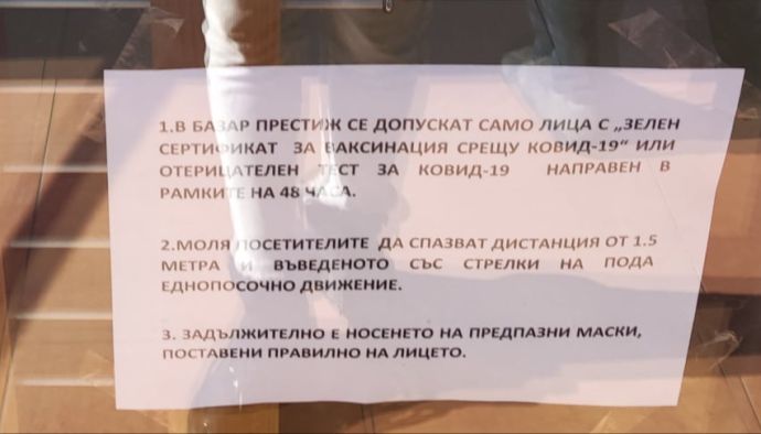 Търговците в център „Престиж“ в бургаския ж.к. „Славейков“ пак посрещнаха с тревоха понеделник, след като сутринта на вратата беше залепена бележка с изискване за „зелен сертификат“.