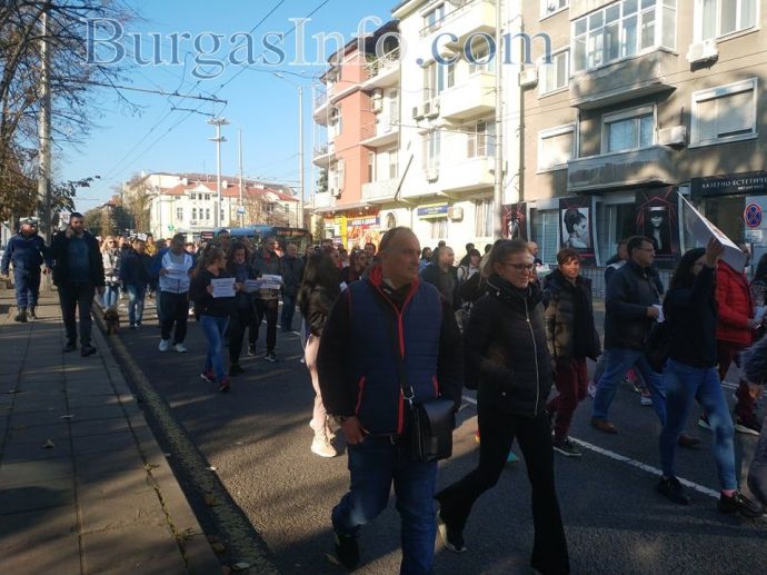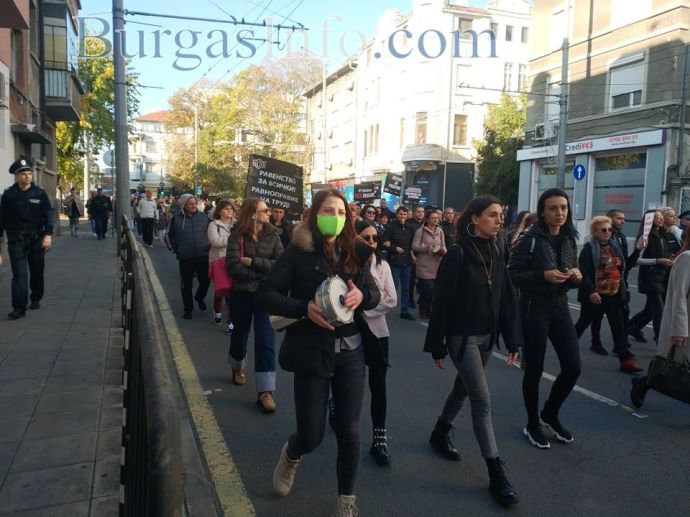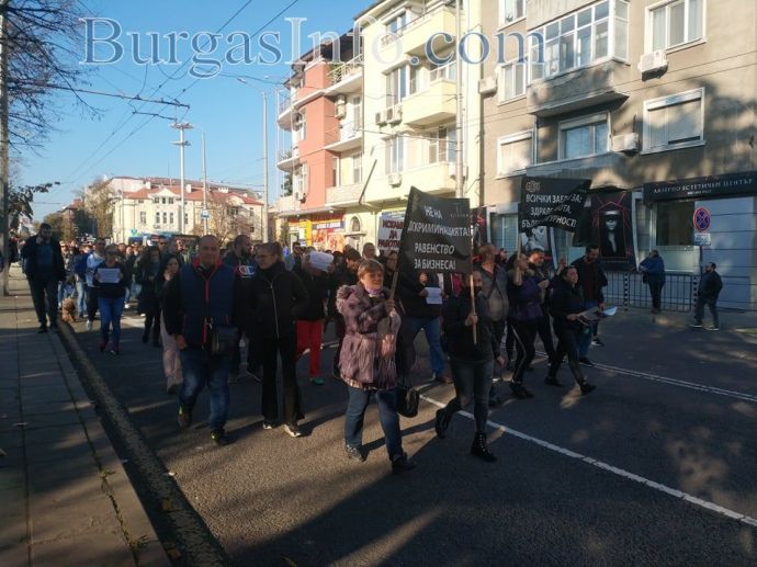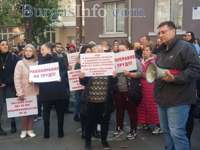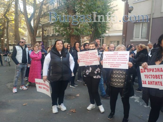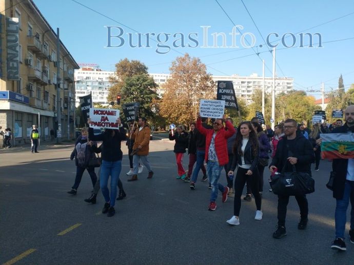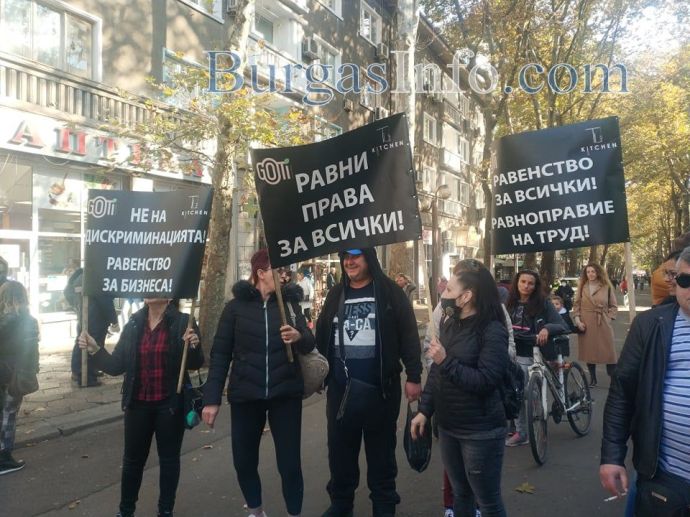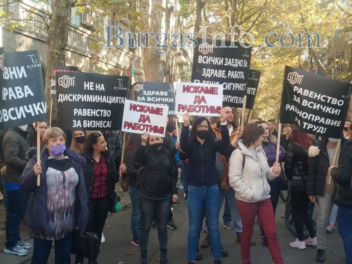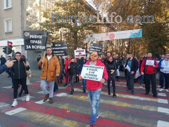 „Няма никакви икономически мерки за нашия бранш, а в същото време текат разходи, като сметки за ток, осигуровки, заплати и др. Правим този протест не само заради нас, а и за нашите клиенти, които нямат „зелени сертификати” и не могат да ни посещават”, заяви управителката на заведение „Алегро” Катя Коларова. Днес тя и около 300 нейни колеги от Бургас се събраха пред сградата на Регионалната здравна инспекция, за да изразят недоволството си от набързо въведените противоепидемични мерки. Те тръгнаха на протестно шествие „Равноправен труд”, което минава от бул. „Сан Стефано” по бул. „Христо Ботев”. Те скандират "Оставка", като призивът е към здравния министър д-р Стойчо Кацаров. Сред плакатите, които издигат, са: "Не на дискриминацията! Равенство на бизнеса", "Искаме да работим", "Да признаят тестовете за антитела".