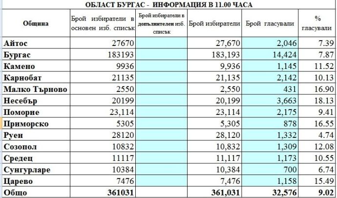 32,576 от имащите право на глас в Бургаско са отишли до урните към 11 ч. днес, сочат данните на РИК. Общият брой на гласоподавателите в областта е 361,031. Това означава, че активността към момента е 9,02%. Най-висока е в община Несебър – 18,13%, следва община Малко Търново – 16,90% и община Приморско – 16,55%. Най-ниска е в община Руен – 4,74%.