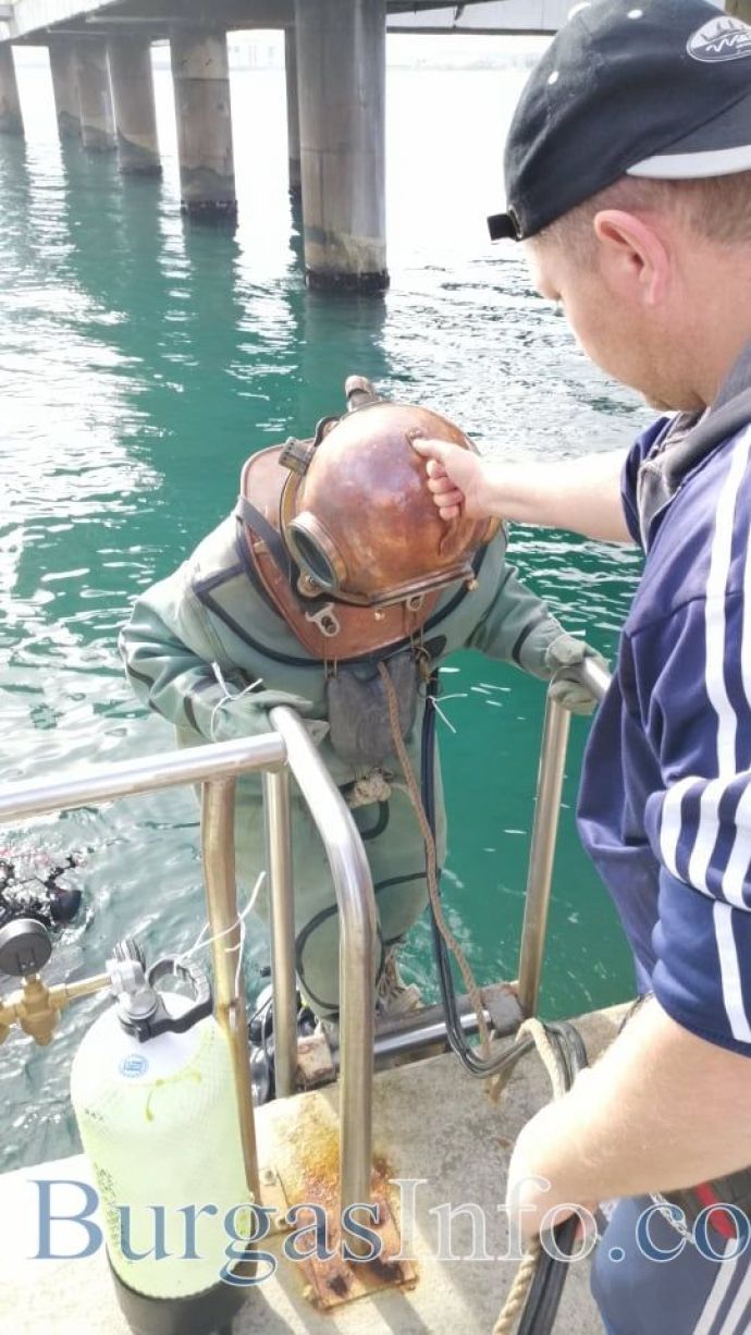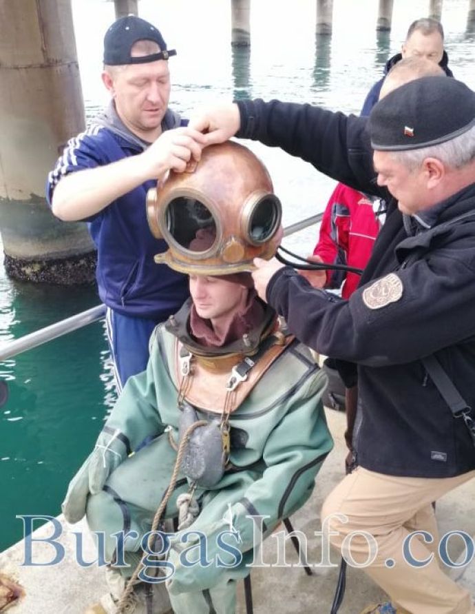 Костюмът, който ентусиастите днес носиха, е с месингов шлем с три илюминатора. Той е свързан със сушата с така наречената "пъпна връв" - шланг, по който до гмуркача постъпва въздух от сушата. Към него е прикрепен и кабел за аудио комуникация, която също бе демонстрирана.