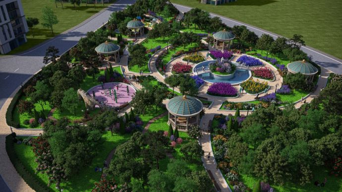 Зони за семейна почивка или срещи с приятели – В парка ще се разполагат 5 ротонди-беседки – художествено оформени архитектурни форми с големи кръгли маси и пейки, всяка от които може комфортно да събере компания от повече от 12 човека за активно общуване, настолни игри и т.н.