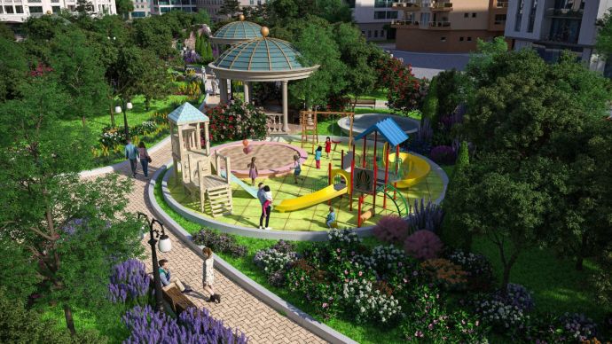 Зони за почивка и забавление за деца – Разнообразно и интересно оборудвана детска площадка с пързалки, люлки, пясъчник за деца и др. , които също така са със специално покритие от плочки с гумени трохи за осигуряване на високо ниво на безопасност за деца. До детската площадка е разположена ротонда-беседка за почивка и комфортно общуване за родители, които едновременно могат да наблюдават своите деца.