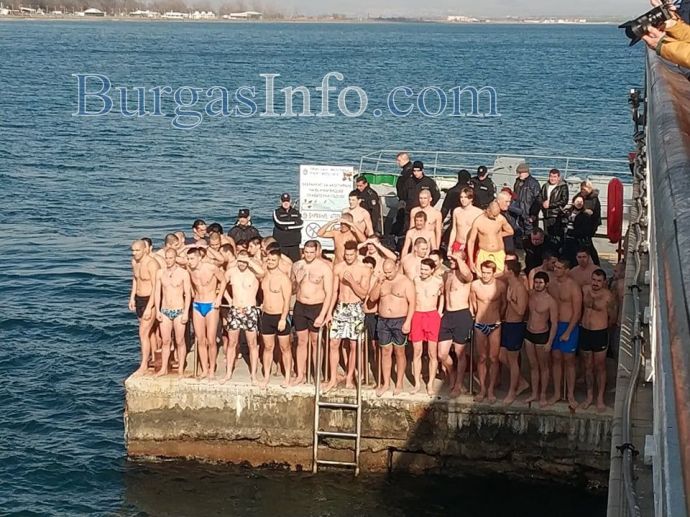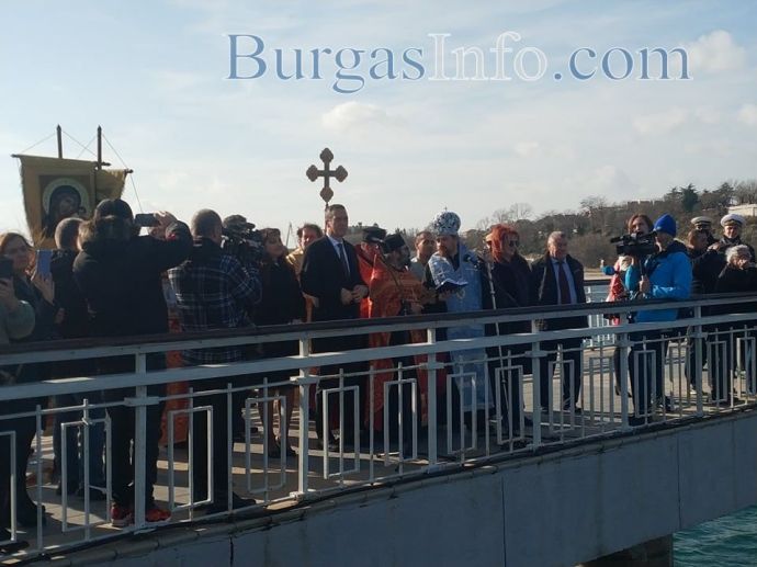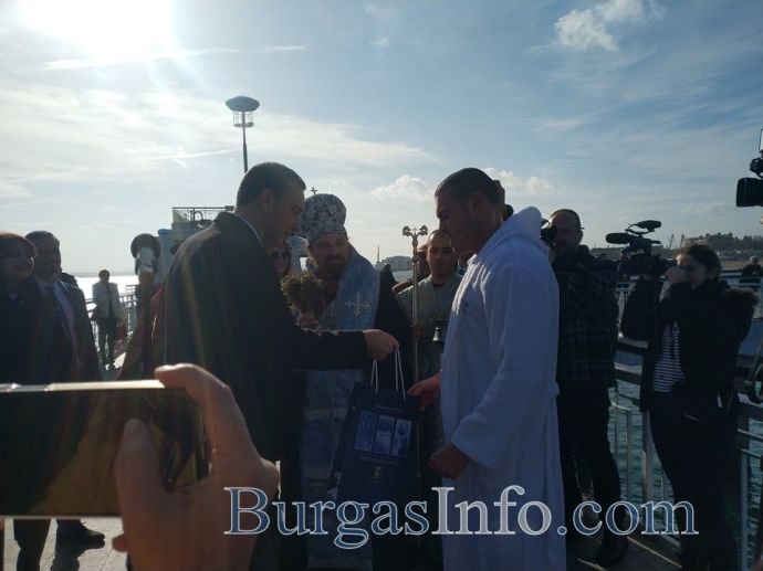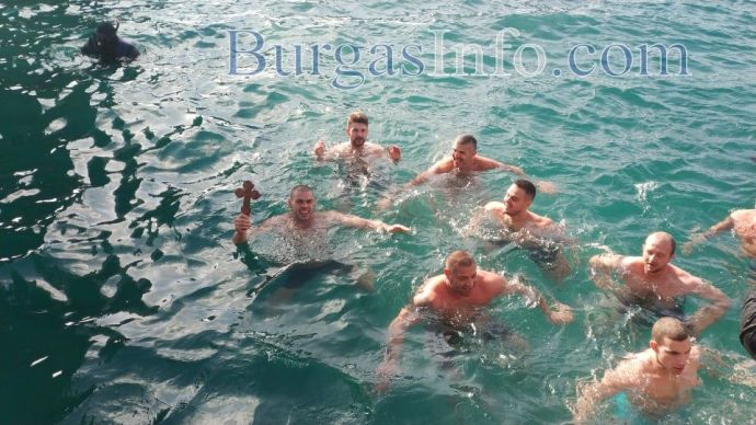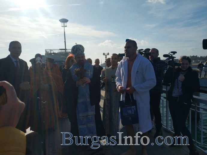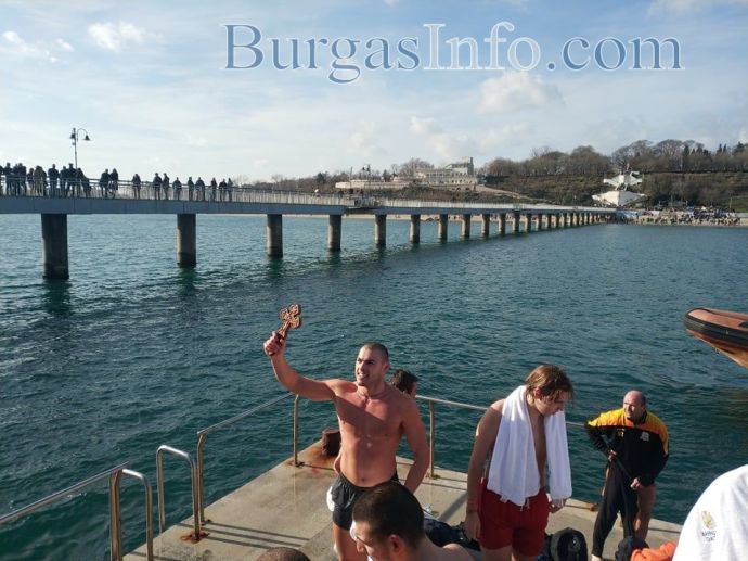 Студентът от НСА Ангел Стойчев първи стигна до кръста в Бургас. За светото разпятие той се надпреварва с рекордния брой от още 61 смелчаци, които се хвърлиха в студените морски води от Моста. Ангел е на 22 години, а според поверието тази година здравето ще е с него.