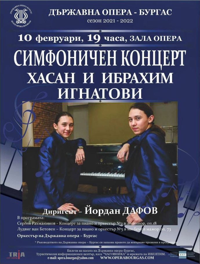 Бургаската опера е подготвила изключително преживяване за ценителите – именитите млади пианисти Хасан и Ибрахим Игнатови, които имат многобройни международни изяви и са носители на редица награди от престижни конкурсни форуми в България и чужбина, ще бъдат солисти на Симфоничния концерт на 10-и февруари, четвъртък, от 19 часа в залата на Бургаската опера. Оркестърът на Държавна опера – Бургас ще партнира на двамата талантливи пианисти под палката на маестро Йордан Дафов, носител на наградата "Златен век" на Министерството на културата. Уважаваният диригент е сред изявените дейци, отличени за приноса си в развитието на културата и утвърждаването на националната идентичност. Концертмайстор на оркестъра на Бургаската опера на концерта в четвъртък ще бъде Ваня Златева.