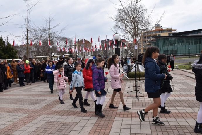 В Поморие честването на Националния празник на България започна с ритуално издигане на българския трибагреник от почетен караул, под звуците на химна, в изпълнение на Общинския духов оркестър с диригент Ангел Панцирков.