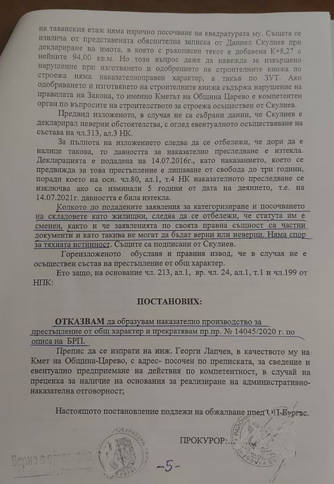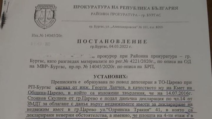 През 2020 год. инж. Лапчев, като кмет на Община Царево, е подал сигнал срещу мен до Районна прокуратура-Бургас за подадена от мен на 14.07.2016 год. /преди издаването на акт 16 за сградата ми/ данъчна декларация по чл. 14 от ЗМДТ, за деклариране на този мой недвижим имот, находящ се в гр. Царево, кв. „Василико”, на ул. „Одринска Тракия” № 41 /там, където живея през цялата година със семейството си и част от която сграда отдавам на туристи през летните сезони от построяването й насам във времето/, както и, че през 2016 год. съм „категоризирал складове” в сградата си за туристи. Оказа се, че Общината нямала екзекутивния проект, който тя самата е одобрила през месец декември на 2014 год. за сградата ми? Дали това е така, защото аз просто не им вярвам, а и като човек, който е работил 8 години с тези хора, знам каква е истината за мен си, и защо този проект НЕ се открива в Общината и НЯМА да се открие. Надеждата беше, че и аз го нямам този проект, за да последват нещата, които бяха си наумили управленците ни, но уви сметките им излязоха криви. По преписката в прокуратурата, когато първоначално се прекрати, на основание представения от мен проект, се използваха аргументи от рода на „главния архитект през времето на одобряването на екзекутивната документация бил в майчинство, т.е. не бил на работа”, че „положения подпис на проекта НЕ бил на главния архитект”, които лансирани тези от общината олекнаха във времето, защото се установи, че НЕ са верни след извършените проверки от разследващите за плащани осигуровки на главния архитект и направената графологическа справка (експертиза) на подписа му положен под проекта ми.