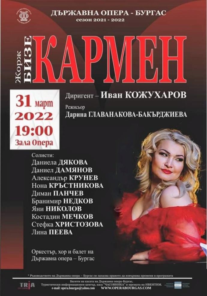 Зад диригентския пулт ще застане маестро Иван Кожухаров, който има таланта и капацитета да превърне всеки спектакъл или концерт под неговата палка в музикално събитие. В ролята на знаменитата страстна циганка Кармен, която е обект на силни и неконтролируеми чувства, безумна ревност, водеща до фатална развръзка, ще бъде невероятното мецосопрано Даниела Дякова, която не крие своето пристрастие и емоционалната си връзка с тази сложна драматична роля. Нейният плътен и наситен глас, с богатство на тембровите нюанси, е изключително подходящ за противоречивия образ, който ще изгради на сцената на Бургаската опера на 31-ви март.