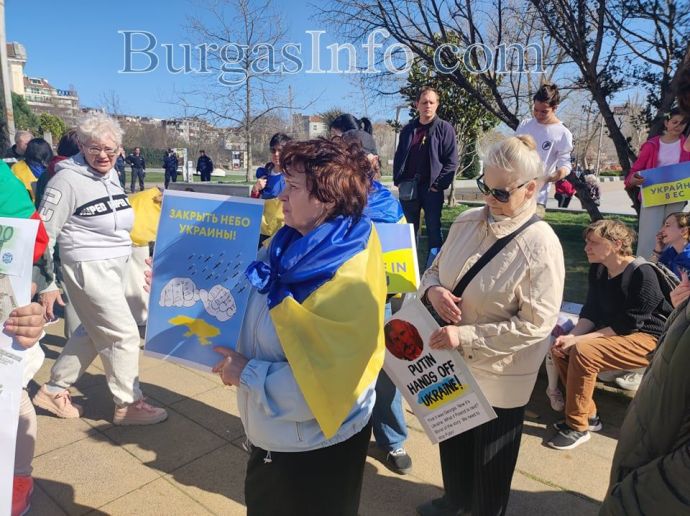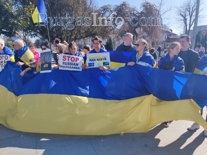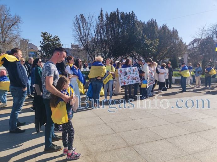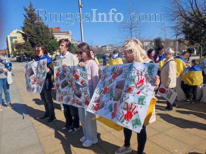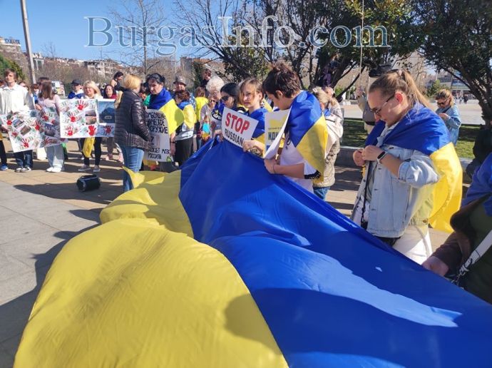 „Спасете мирните хора. Човешкият живот не струва пари. Наложете ембарго върху купуването на газ от Русия". Това беше посланието на украинците в Бургас, които за пореден ден излязоха на демонстрация на площад „Тройката”. Те опънаха плакати, с които искаха да покажат, че са бомбардирани сгради, които не са военни обекти – културни институции, административни здания и др.