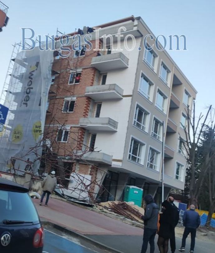 Бурният вятър и в събота създаде неуредици за хората в Бургас въпреки иначе слънцето и приятните температури. Поривите сринаха цяло скеле на 5-етажна новострояща се сграда в бургаския ж.к. "Славейков". Тя се намира срещу блок 64а . Тази вечер бяха на място работници, които отстраняваха останките, за да не застрашават хора. Няма пострадали, казаха представители на фирмата.