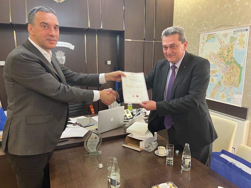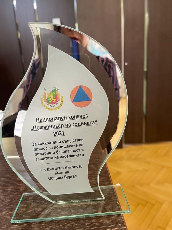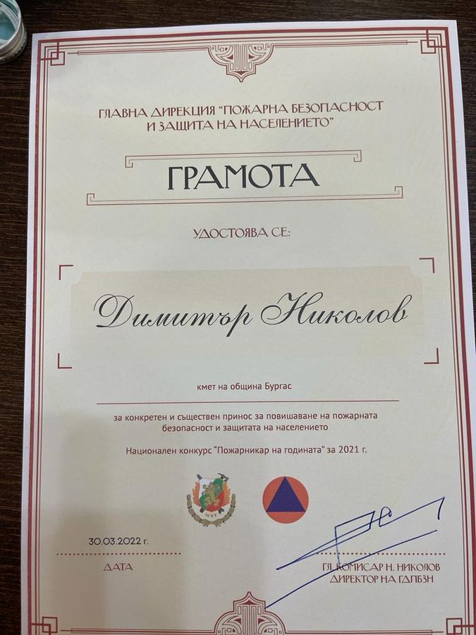 Директорът на Главна дирекция „Пожарна безопасност“ главен комисар Николай Николов даде висока оценка на Община Бургас и кмета Димитър Николов за повишаването на пожарната безопасност и сигурността на гражданите. Той връчи по този повод на бургаския кмет специална награда и благодарствена грамота.