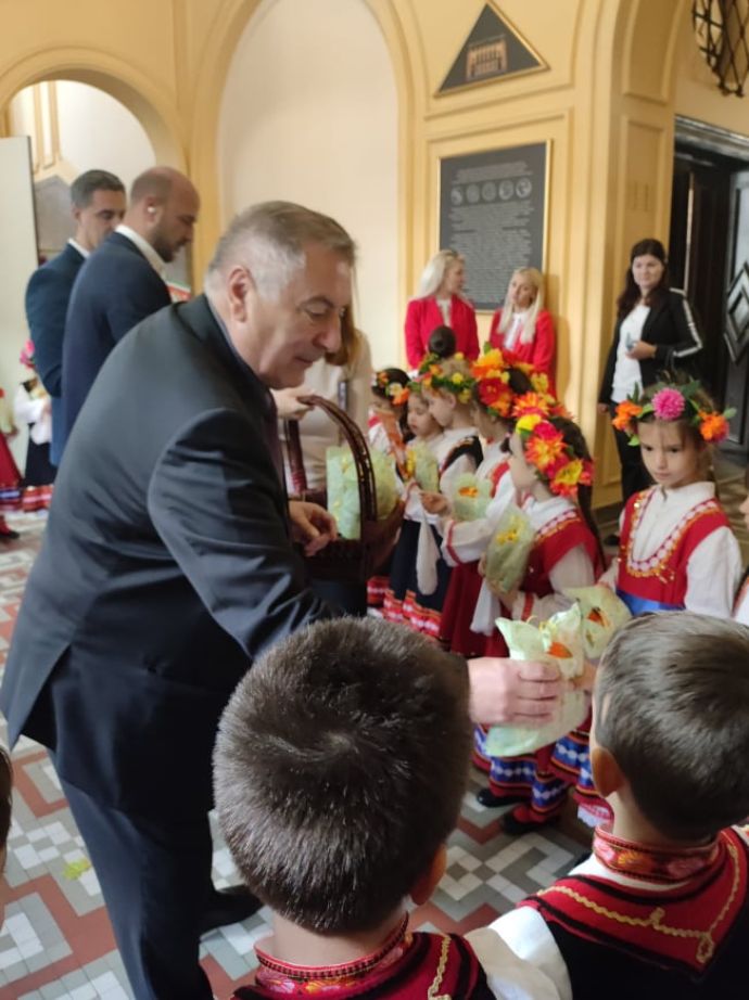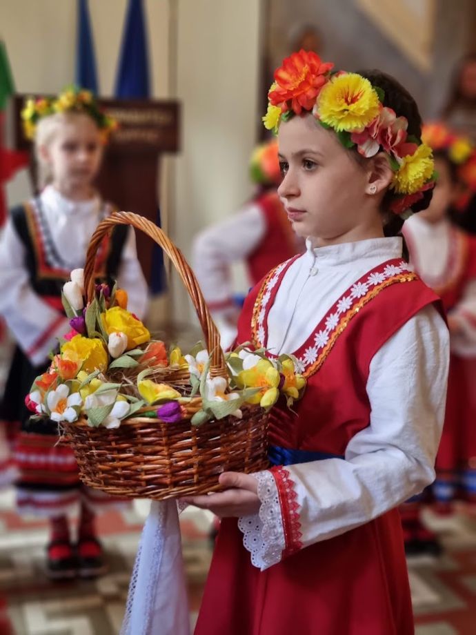 Облечени в цветни народни носии, децата внесоха пролетно празнично настроение в сградата на Областна администрация, като изпълниха песни, танци, наричания за здраве и късмет.