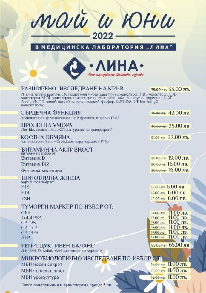 Медицинска лаборатория „ЛИНА” обявява 9 нови профилактични кампании с изследвания на преференциални цени. Те важат през месеците май и юни 2022 г. в самостоятелните ѝ филиали в страната, като за тях НЕ е необходимо записване на час или направление от лекар. Таксата венепункция и транспортна среда е 2 лв.