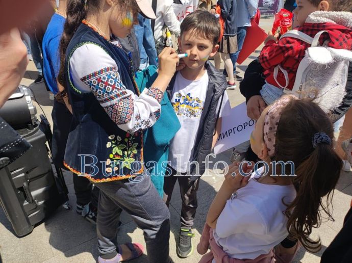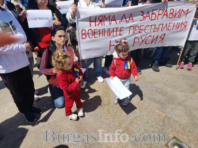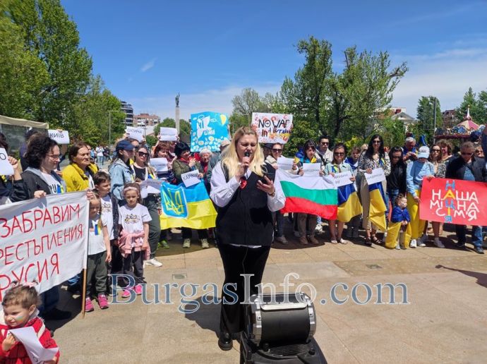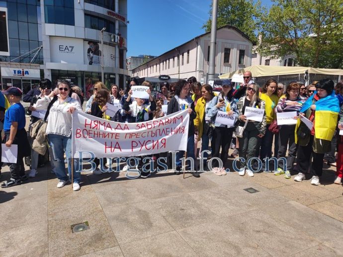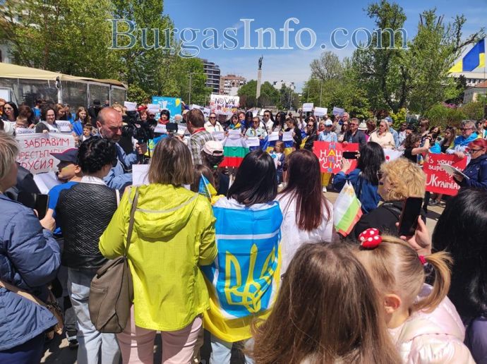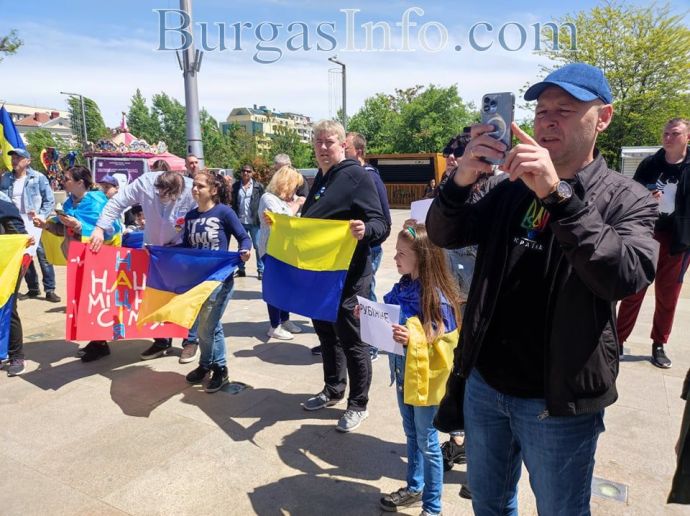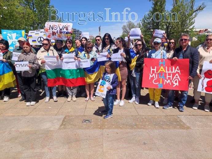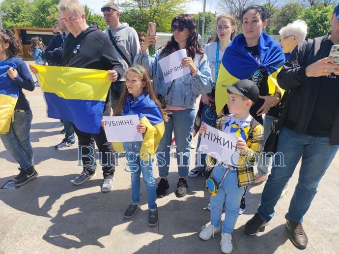 Десетки украинци, намерили убежище в Бургас и региона, се събраха на площад „Тройката”, за да отдадат почит към жертвите на войната. Тяхната демонстрация този път беше в противоположния край на площада, а не на обичайното място – непосредствено под паметника на Альоша.![]()