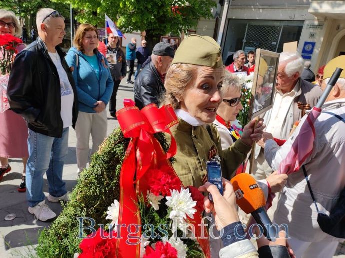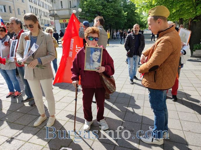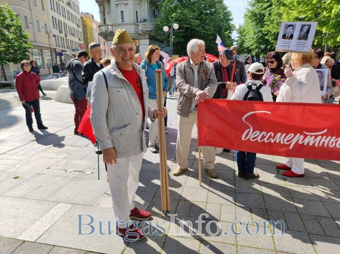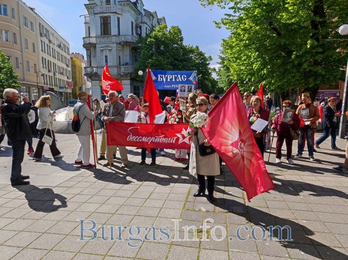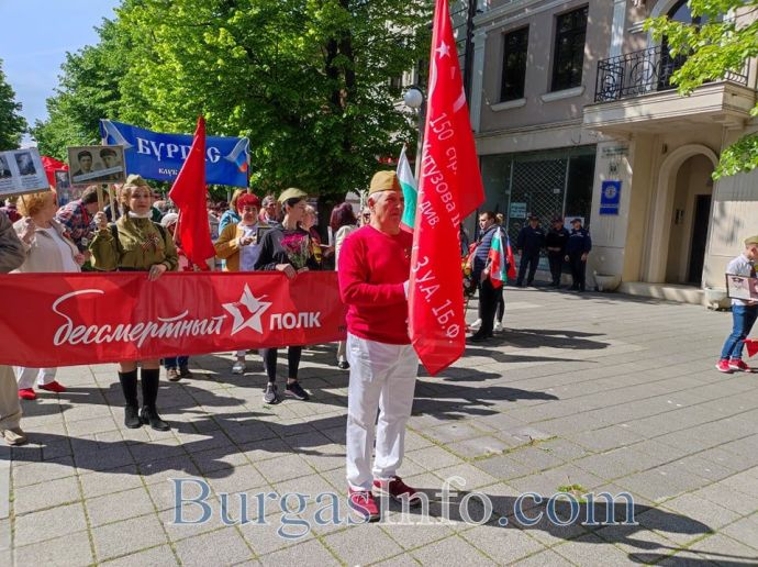 Шествието на безсмъртния полк преминава към този момент през централната ул. „Александровска” в Бургас. Около 70 души се включиха в него. Те развяват червени знамена със сърп и чук, носят ликове на загинали свои близки във Втората световна война, присъстващите отдават почит и по този начин отбелязват Деня на победата. Повечето от тях смятат, че шествието им не е провокация в сложната ситуация около войната с Украйна в момента. Те смятат, че сега Русия защитава населението на Донбас.