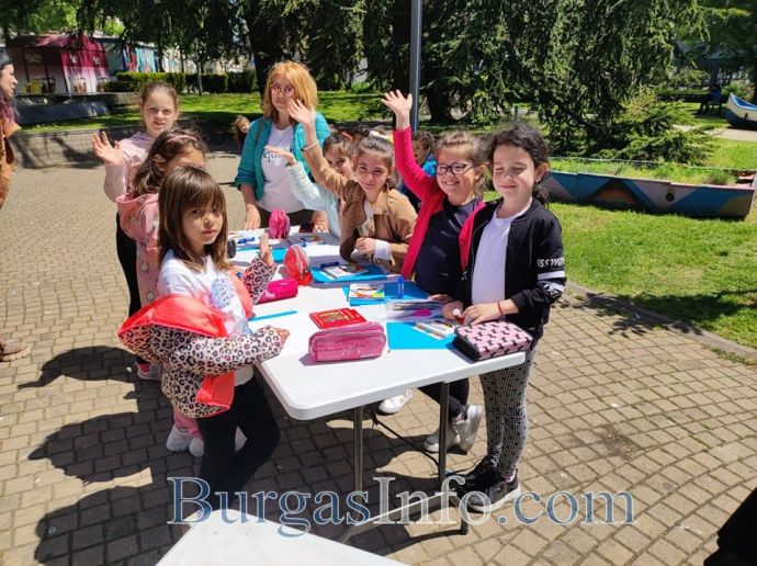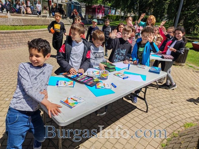Първолачета от ОУ „Петко Рачев Славейков”, както и украински деца започнаха да изработват знамето на ЕС в центъра на Бургас. Това е част от тържественото отбелязване на Деня на Европа в морския град. Децата с много ентусиазъм и усмивки се включиха в арт работилничките, разположени край Часовника в цетъра на града. Там празнично настроение създава и духовият оркестър, който започна концерта си на открито с „Ода на радостта”. По този наичн тържествата за празника привлякоха вниманието и повдигнаха настроението и на много случайни минувачи.