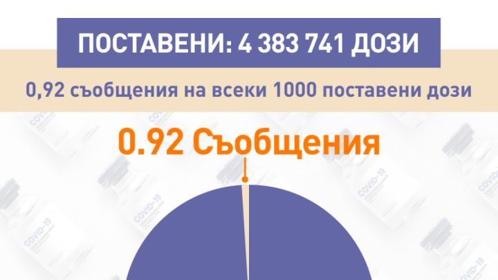 При приложени 4 383 741 дози ваксини срещу COVID-19 в страната към 3 май т. г. в Изпълнителната агенция по лекарствата са постъпили общо 4 069 съобщения за постваксинални реакции. Това представлява 0,092% от всички поставени дози. Съобщенията за нежелани реакции по видове ваксини са: Spikevax – 428; Comirnaty – 1 151; Vaxzevria – 2 324; Janssen – 166.