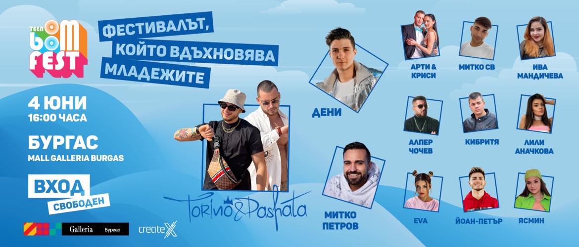 Сред специалните ни гости са и латино кралете Торино и Пашата, които първо ще разписват и снимат с феновете, а после ще изпълнят най-големите си хитове. В концертът ще се включат още EVA, Митко Петров - MATEO и Дени Антилопата. TEEN BOOM FEST в колаборация с Мall Galleria Burgas ще обърнат специално внимание на актуалните теми от света на подрастващите - ще си поговорим за опасностите, които ги заобикалят - употребата на алкохол, превенцията срещу наркотици, агресия и други.