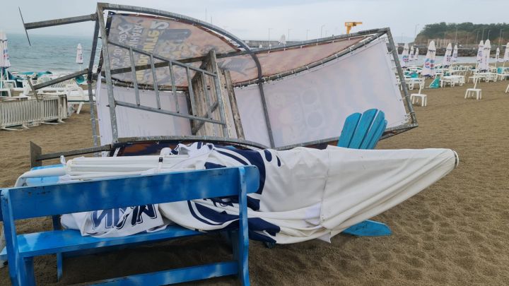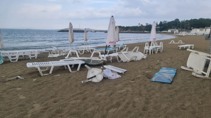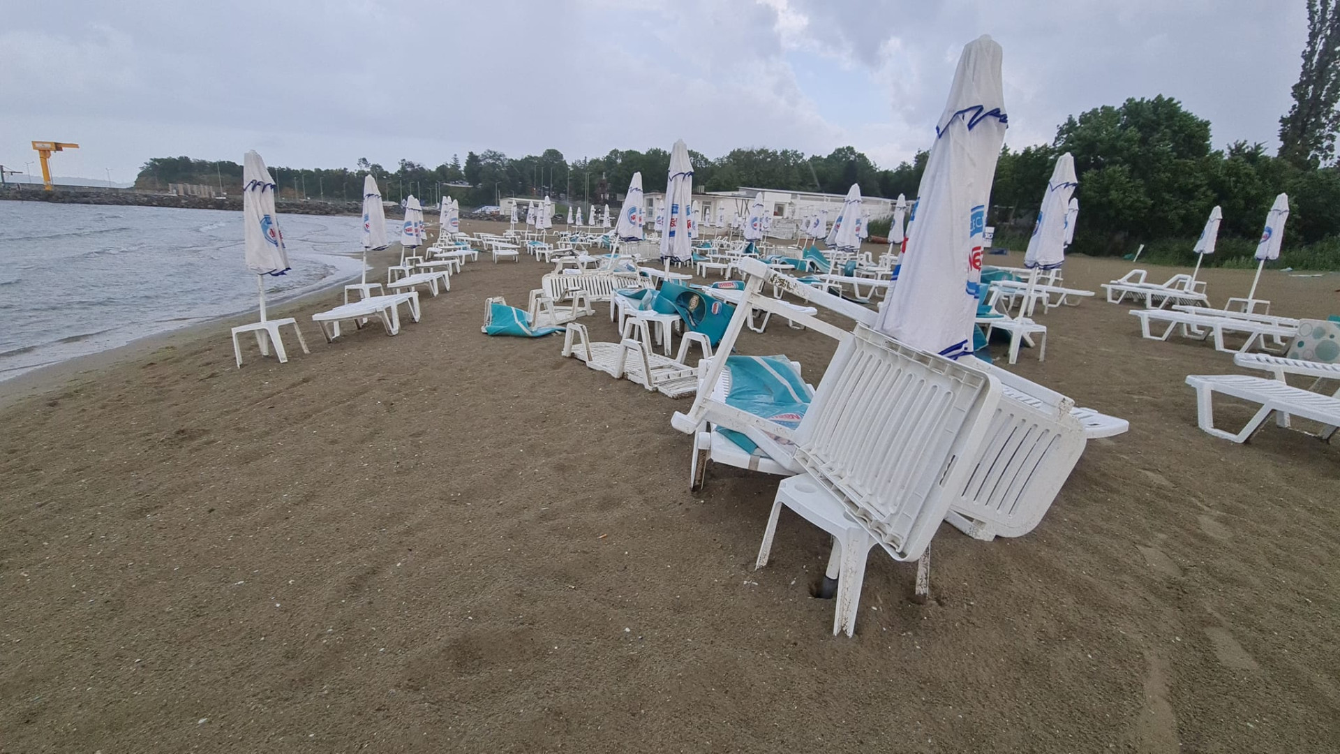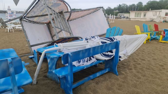 Половинчасова буря, разразила се в Бургас, помете шезлонжи, чадъри на плажа в Крайморие, който е един от най-поддържаните и предпочитани по Южното Черноморие. Обърнати са и вишки на спасителите, както и пейки на намиращото се там оборотно заведение. "Ураган мина през плажа", съобщи неговата собственичка Мая Пепелянкова.