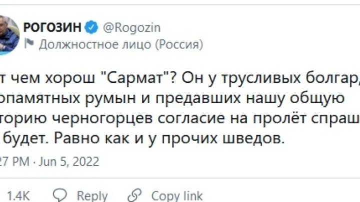 В социалната мрежа Рогозин написа: „Ето какво е доброто на „Сармат”: няма да поиска разрешение да прелети над страхливите българи, отмъстителните румънци и черногорците, които са предали общата ни история. Както и от шведите”.