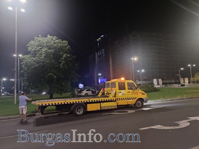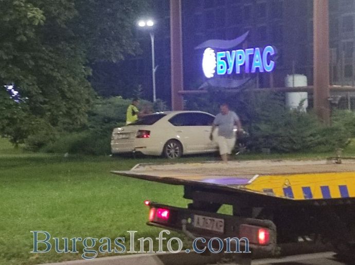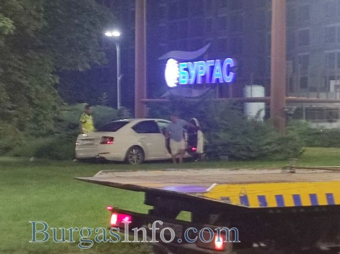 Лек автомобил „Шкода” катастрофира самостоятелно на кръговото кръстовище край магазин „Метро”, точно на входа на Бургас, откъм АМ „Тракия”. Колата е излетяла в зеления остров, където са знамената, посрещащи гостите на града и се е забила в декоративните храсти.