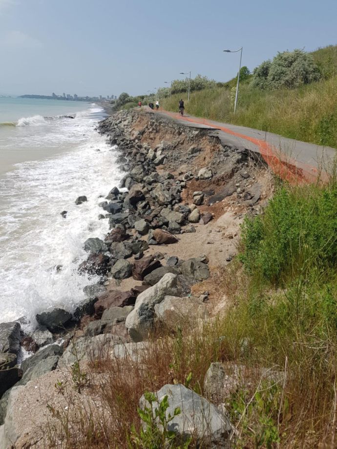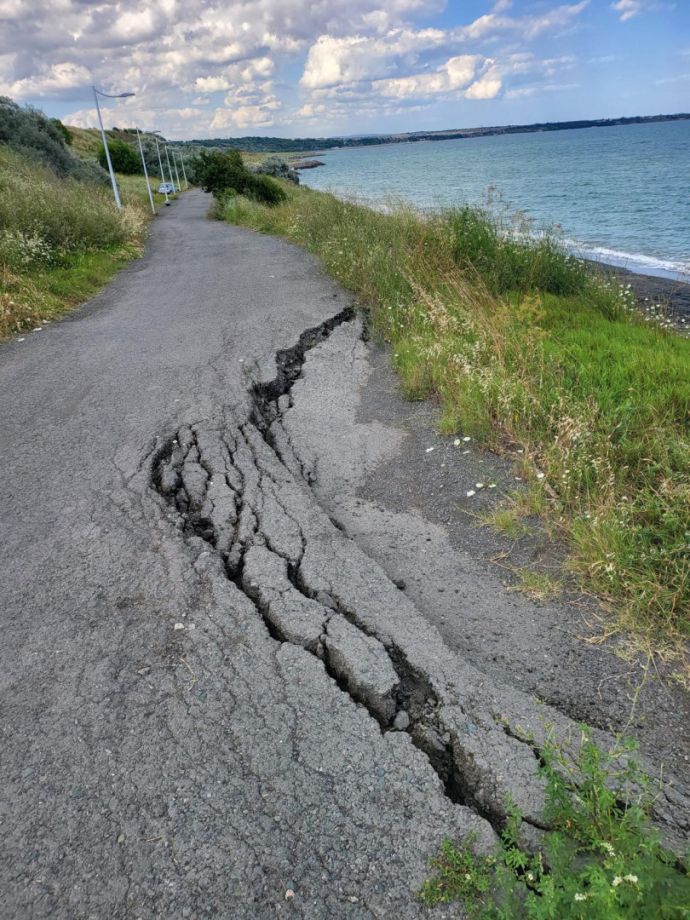 "В зоната след брегоукрепителната дамба има участък с недостатъчна ширина на плажа, следствие на което се проявяват абразионни процеси, които от своя страна предизвикват свличане на земни маси въпреки направената импровизирана брегозащита с едри скални блокове. Процесът е динамичен и е свързан с вълновата активност. Ако не се вземат мерки до 2-3 месеца крайбрежната алея в долната си част ще бъде прекъсната", обясни за БургасИНФО външният експерт инж. Маринов.