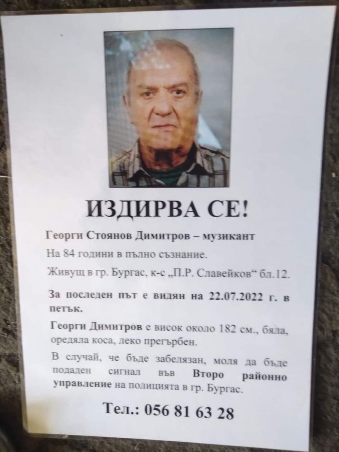 Близки издирват 84-годишния музикант Георги Димитров от бургаския ж.к. „Славейков“. Той бил пълно съзнание. Призивът за помощ бе отправен в соиалните мрежи.