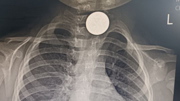 Допреди десетина дни, когато внезапно започва да вдига необяснимо висока температура. „Отиваме при личната – един антибиотик. Спада. После пак вдига – втори антибиотик. И не минава. Усъмни се да няма нещо в белия дроб и пак ни насочи за снимка“, разказва бащата. При снимката на белия дроб монетата лъсва точно на входа на хранопровода – в края на гърлото. Лаборантката се учудва – да не би детето да е било с медальон, който не е свален преди рентгена? Тогава майката се сеща за играта с монети и се изяснява, че това е глътнатата стотинка - заклещена дълбоко навътре в гърлото, в самото начало на хранопровода.![]()