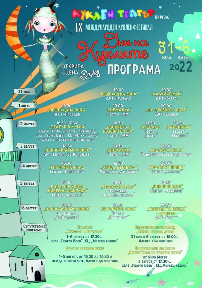 От 31 юли до 6 август на открита сцена "Охлюва" ще се проведат най-чаканите от малчуганите летни дни. 11 театъра, 21 представления, 2 изложби – интерактивната „Кукли, театър, деца” и „Кукли от природата”, детски работилнички, „Театър в кутия”, игри и представяне на книгата „Ненаиграли се куклени пиеси” от Янко Митев са част от IX-то издание на Международния куклен фестивал в Бургас “Дни на куклите”.