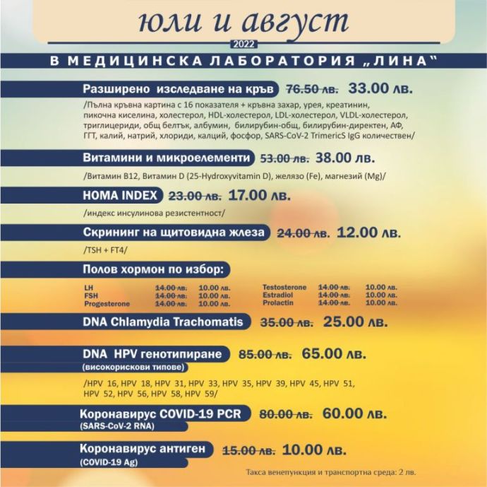 Медицинска лаборатория „ЛИНА” е първата в страната, която въведе месечни профилактични кампании с грижа за пациента. Те важат във всеки от самостоятелните ѝ филиали. Таксата венепункция и транспортна среда е 2 лв.