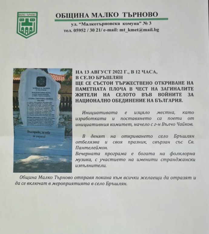 Странджа помни своите герои. На 13 август в 12 часа в село Бръшлян, община Малко Търново, ще се състои тържествено откриване на паметната плоча в чест на загиналите жители на селото във войните за националното обединение на България.