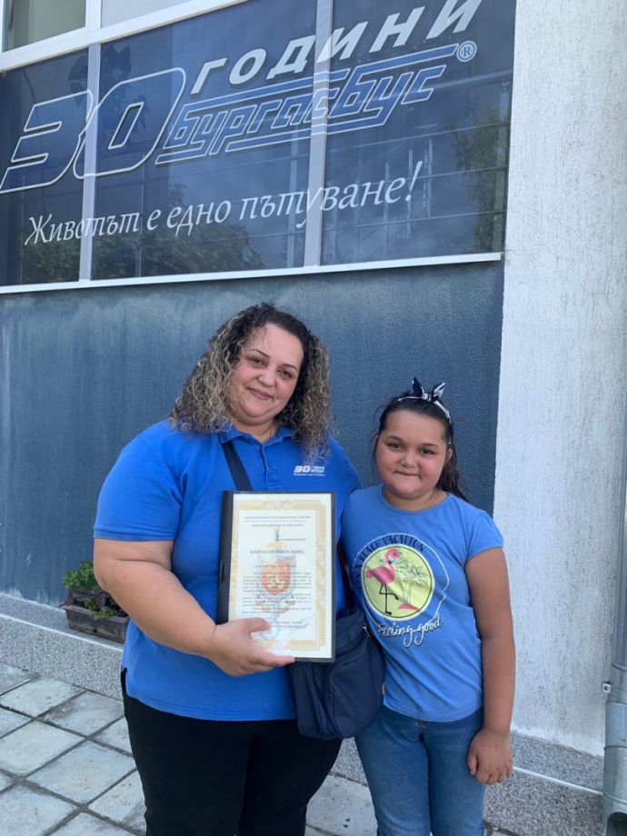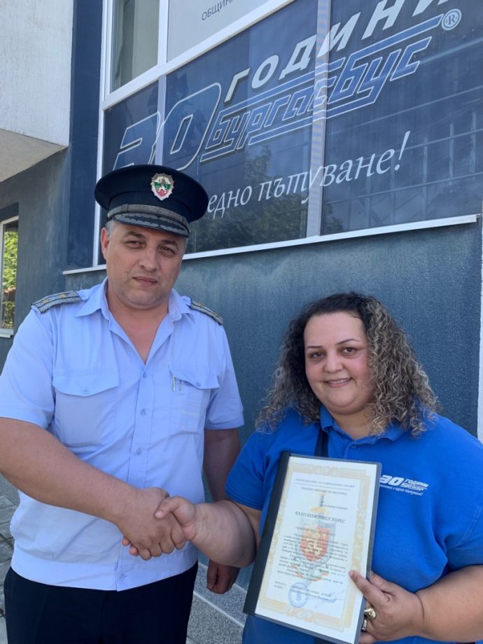 За благородната си постъпка Мария Добрева получи от ОДМВР - Бургас благодарствен адрес, връчен й от временно изпълняващия длъжността началник отдел „Охранителна полиция и КАТ” старши инспектор Павел Колев. На жената бе връчено и парично поощрение от общинската фирма-превозвач „Бургас бус” с управител инж. Петко Драгнев и синдикалната организация на служителите във фирмата. По време на тържествената церемония, състояла се във фирма „Бургасбус”, Мария бе придружена от съпруга си – шофьор в общинската фирма превозвач от три години и третата си дъщеря – 8 годишната Михаела, която с възхищение и радост слушаше похвалите към 34-годишната й майка.