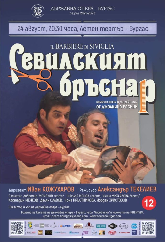 След големия успех на спектаклите на „Севилският бръснар“ на бургаска сцена – в изцяло нов прочит на режисьора доц. д-р Александър Текелиев, сценографа и костюмограф Денис Иванов и диригент-постановчика маестро Иван Кожухаров, предстои за втори път представление на най-известната комична опера от Джоакино Росини на сцената на Летен театър – Бургас, след спектакъла на 7 юли, също в рамките на Бургаските музикални празници „Емил Чакъров“ 2022. Спектакълът на най-жизнерадостната опера на Росини е на 24-ти август от 20.30 часа на откритата сцена в Приморския парк. Миналогодишната премиера на „Севилският бръснар“, предвидена за 23 август на същата сцена, бе отложена поради обективни причини. Успешна бе премиерата при пълен салон /при тогавашния допустим капацитет от 50%/ – на 8 октомври 2021 г., и втора премиера, също при очакван успех – на 26 октомври – в залата на Бургаската опера. Последваха спектакли през м. декември 2021 г., м. април и м. юли т. год. – всички, преминали при интерес от страна на любопитната за иновативни режисьорски и сценографски търсения публика.