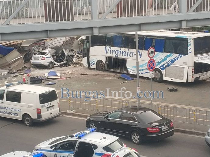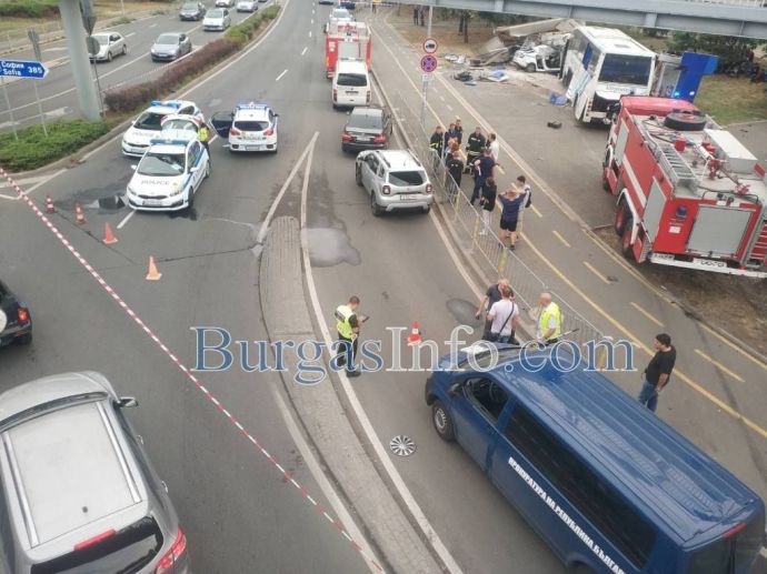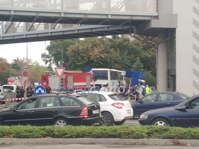 Tежък пътен инцидент е станал тази сутрин, около 5 часа, на кръстовище “Трапезица” в Бургас. Автобус с чуждестранна регистрация е ударил служебен полицейски автомобил.