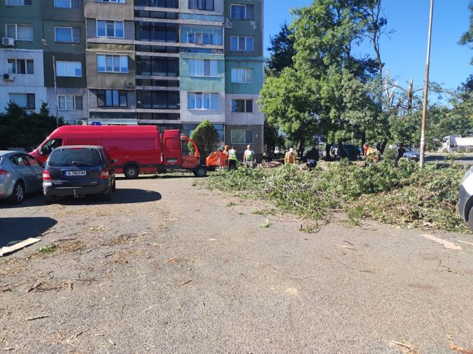 На много места има дървета, по които има заплетени отчупени клони, така че хората трябва да внимават, преминавайки под тях. Има случаи на затрупани автомобили, чиито собственици не са ги преместили от събота. Шкода бе извадена от района на блок 42, а общинска техника премести друга лека кола, паркирана пред блок 60.