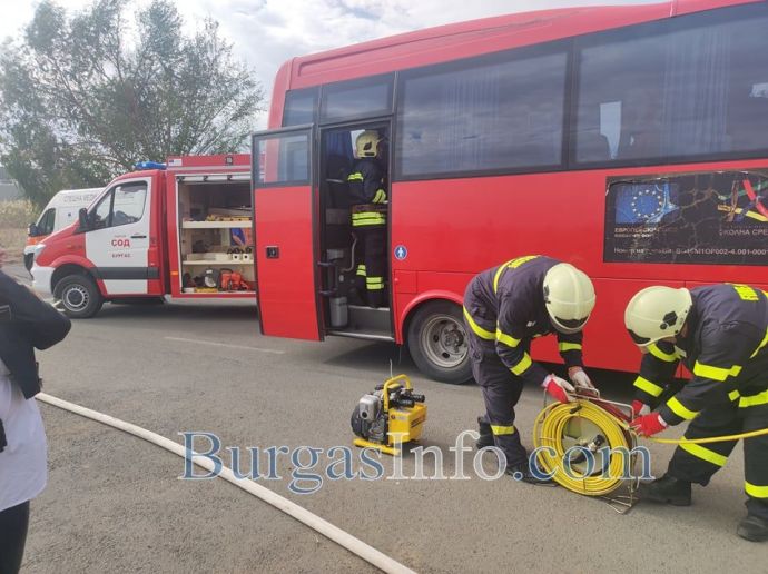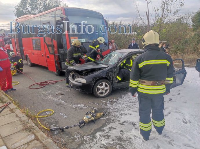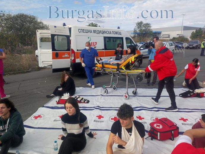 Тежка катастрофа между автобус с деца, лека кола със загинал човек и камион – това беше картината, която събра всички служби край бившия мол „Странд” в Бургас. Тя беше част от учение, което показа как действат полиция, противопожарна служба, Спешна помощ, Автомобила администрация и БЧК в подобни случаи. В автобуса имаше „ранени” деца, които бързо бяха изведени на открито, тъй като при подадения сигнал стана ясно, че има риск от запалване на камиона, заради теч на гориво. На ранените беше оказана веднага медицинска помощ, като двама от тях бяха откарани с линейка. Наложи се пожарникарите да изкъртят вратите и стъклото на леката кола, за да извадят намиращия се вътре „труп”.