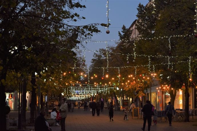 Празничното настроение по пешеходната зона ще създават над 500 висулки, които ще бъдат комбинирани с разноцветни светещи топки.