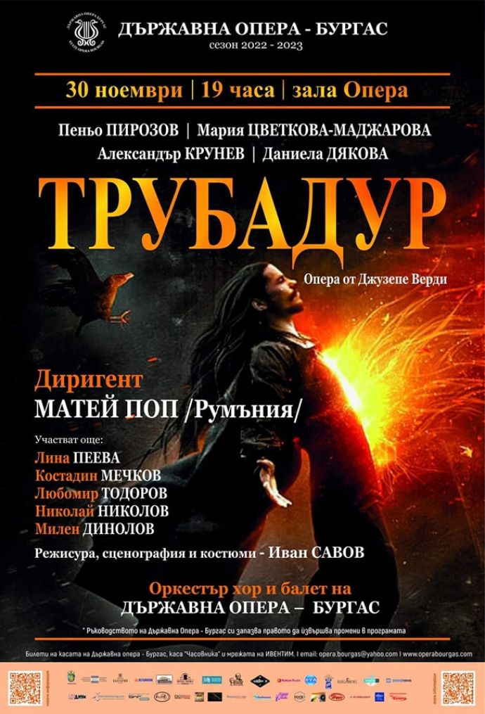 „Трубадур“ е една от най-популярните оперни произведения на Джузепе Верди, заради драматичния си сюжет и образите, превърнали се в емблематични – знаменитата циганка Азучена, трубадура Манрико, красавицата Леонора – с чистата си душевност и красива нещастна любов, както и Граф Ди Луна – с отблъснато и наранено сърце, търсещо упование в реванша и отмъщението. Красивата Вердиева музика ще събере на сцената на Държавна опера – Бургас именити артисти.