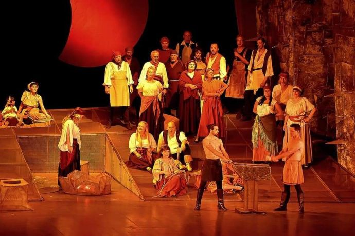 Впечатляващата режисура и сценографията, съдържаща семиотични елементи, както и красивите костюми, напълно в духа на представяната епоха, са дело на Иван Савов. Диригент на хоровия състав – основен участник в развитието на драматизма на сценичното действие, е Невена Михайлова. Пластиката е на Галина Калчева. Концертмайстор е Христо Белчев,