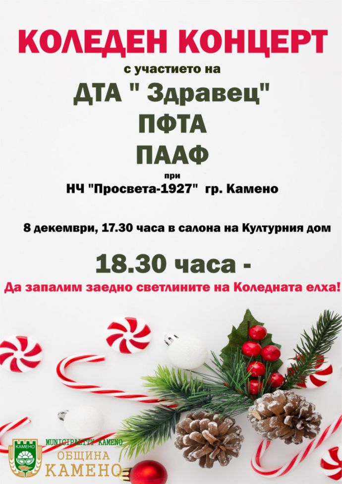 Грандиозен концерт на ТА “Здравец” към "Читалище "Просвета-1927" ще зарадва за поредна година жителите на Камено дни преди най-красивият и благословен празник в годината - Рождество Христово. Три поколения танцьори ще покажат отново своите майсторски умения във фолклора. Събитието ще се състои на 8 декември от 17.30 часа в концертната зала на Културния дом. Водещ ще е актьорът Валери Еличов.