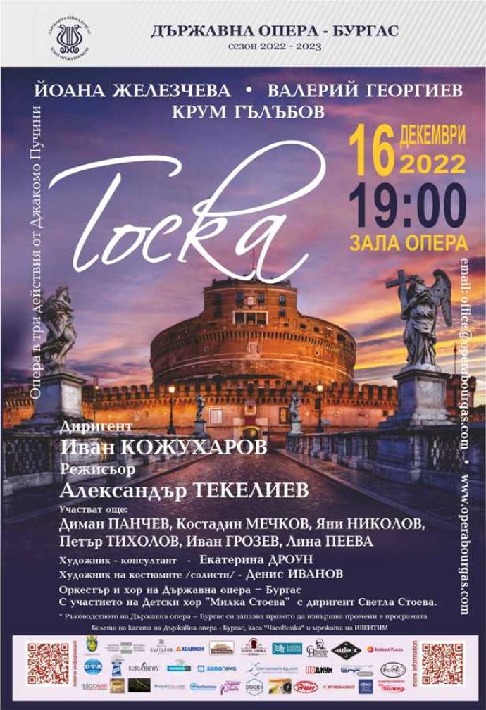 На 16 декември от 19 часа в залата на Държавна Опера Бургас ще бъде разказана трагичната история на Тоска. В ролята на красивата, горда и отстояваща силата на чувствата си примадона Флория Тоска бургаската публика ще има удоволствието да види отново изключителното драматично сопрано Йоана Железчева, която преди дни направи своя дебют на сцената на Държавна опера – Варна, пресъздавайки образа. Със сигурност Йоана Железчева ще бъде отново неотразима и в новото си артистично амплоа. Нейните почитатели очакват с обяснимо вълнение да вдъхне живот и емоционална сила на емблематичния за оперното творчество женски образ, коронен за световни прими като Мария Калас и Райна Кабаиванска, и на сцената в Бургас.![]()