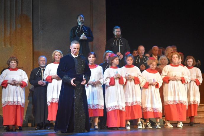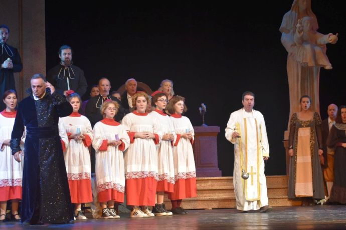 Като избягалия затворник Чезаре Анджелоти и бивш консул на някогашната свободна Римска република на сцената излиза басът Диман Панчев. Чудесен е целият артистичен състав – в образите на Клисаря и Тъмничаря влиза Костадин Мечков, бас, Сполета, полицейски агент, ще бъде тенорът Яни Николов, Шароне – басът Петър Тихолов, Тъмничар – Иван Грозев, Овчарче – Лина Пеева. В спектакъла участват оркестърът и хорът на Държавна опера – Бургас, както и прекрасните певци от Детски хор "Милка Стоева" с диригент Светла Стоева. Младите хористи през настоящата календарна година участваха успешно в няколко прояви на Бургаската опера – в операта "Кармен" от Жорж Бизе, също под диригентската палка на Иван Кожухаров, във Великденския концерт с диригент Йордан Дафов, в операта "Турандот" – на 22‐ри юли на сцената на Летния театър в Бургас, под палката на маестро Григор Паликаров, както и в тържествения концерт по случай 80-годишнината на проф. Александър Текелиев – през м. октомври, под диригентството на маестро Славил Димитров. Предстои тяхно участие в традиционния Коледен концерт на Държавна опера – Бургас – на 22 декември от 19 часа на сцената на Операта, диригент – Йордан Дафов.