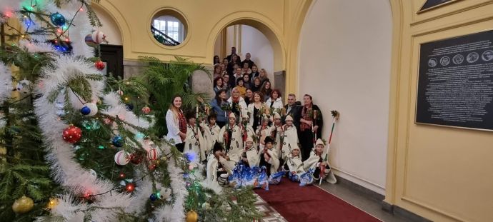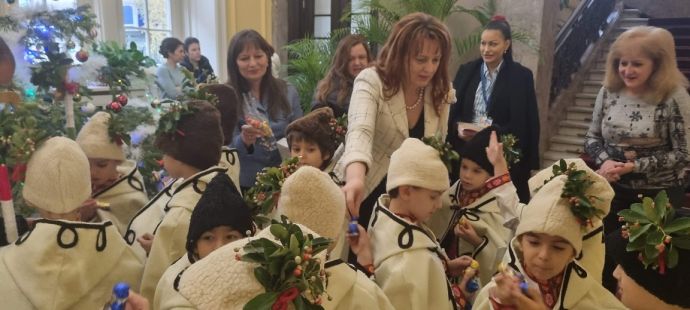 Проф. Нейкова лично посрещна скъпите гости. С дебели ямурлуци, с ритуални геги с краваи и китка за здраве, богато украсени калпаци и с греещи от усмивки лица, малчуганите представиха богат репертоар от коледарски песни и наричания и зарадваха служителите на администрацията със знанията си за традициите.