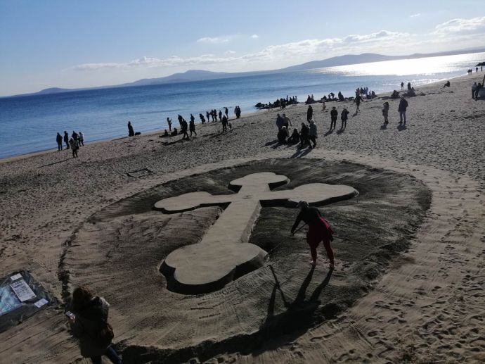Същевременно пясъчните художници Пол и Реми сътвориха на бургаския плаж 13- метров кръст за празника.