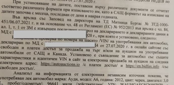 Документ, от който е видно как Митница-Бургас определя цената на внесения автомобил